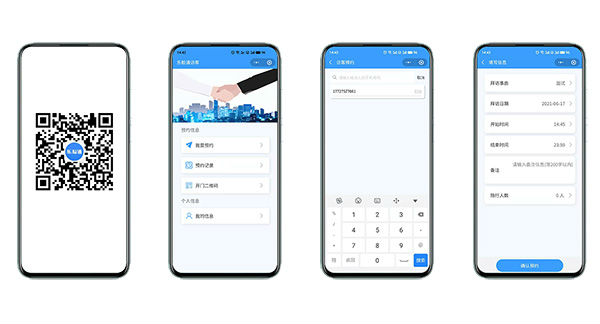 访客通过老师分享的链接、或扫访客机上二维码进入访客预约页面(H5页面或者微信公众号),在线进行访客申请,依次填写被访教师工号、姓名、事由、时间、健康码截图等信息,等待管理员审核完成,访客在个人的信息上会生成通行二维码,到访即可扫码通行。